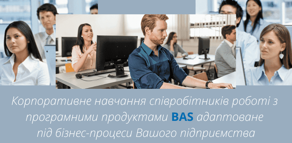 Корпоративне навчання робітників ефективній роботі з використанням в організації програмними продуктами без відриву від виробництва. Це можливість підвищити результативність роботи компанії завдяки більш грамотному використанню функціоналу програмного продукту “BAS”.
